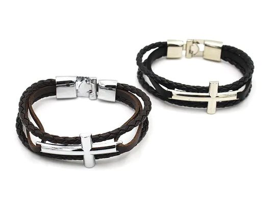Men's Leather Bracelet with Cross Silver Buckle